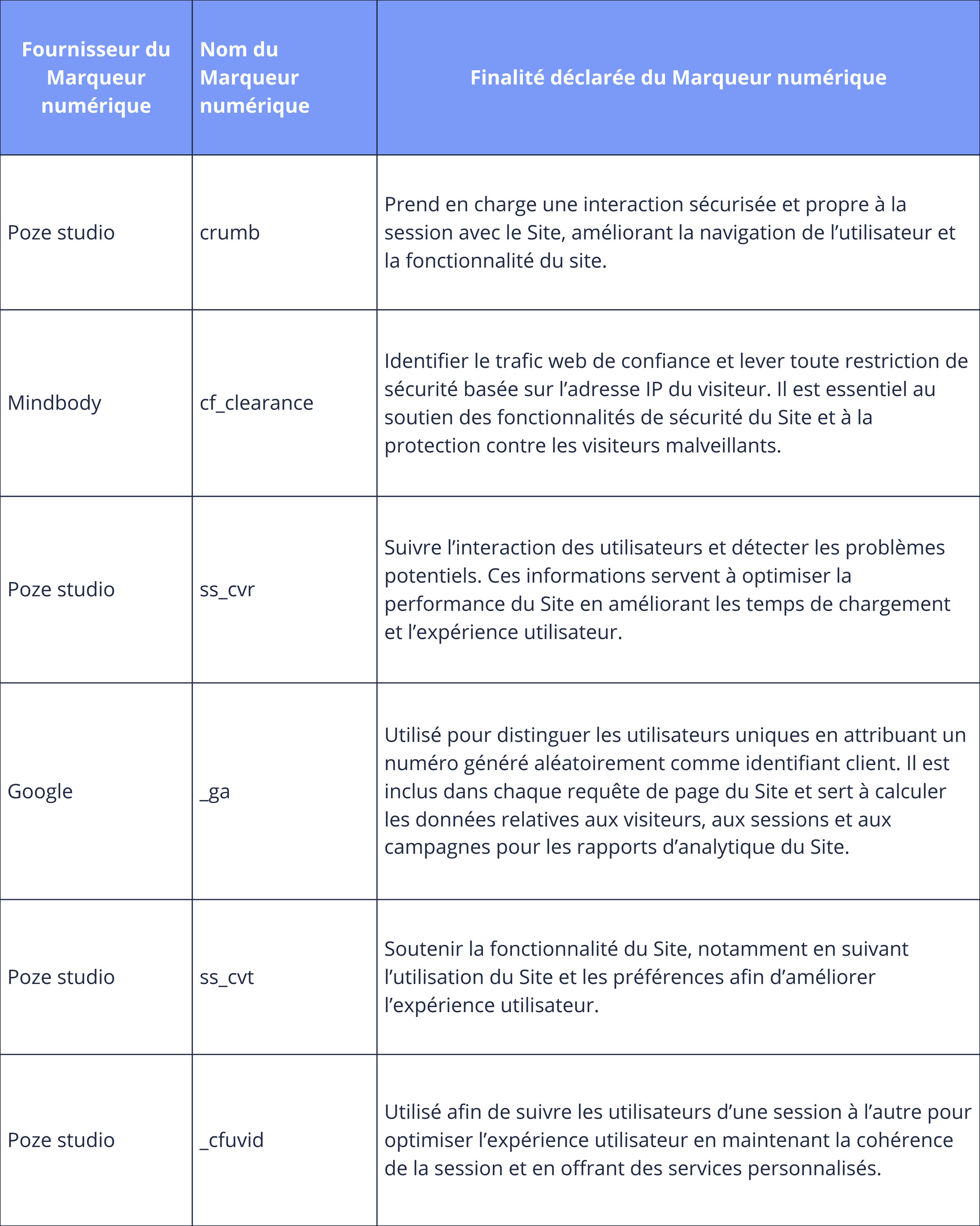 Autorisation à la collecte de renseignements personnels à des fins de profilage, d’identification ou de localisation. En raison de l’utilisation de certains Marqueurs numériques (voir tableau récapitulatif joint comme annexe à la présente Politique), nous pouvons recueillir des renseignements personnels en ayant recours à une technologie comprenant des fonctions permettant de vous identifier, de vous localiser et/ou d’effectuer un profilage. Les fonctions nous permettant de recueillir vos renseignements personnels à des fins d’identification, de localisation et de profilage sont désactivées par défaut. Vous pouvez activer ces fonctions en donnant votre consentement explicite, soit en appuyant sur le bouton approprié de la fenêtre intempestive qui apparaît lorsque vous accédez au Site et/ou à la Plateforme.